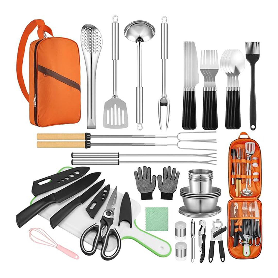 - 45-Pcs Camp Cookware & Tableware Kit – Includes1 grill spatula, 4 barbecue forks, 1 stainless steel BBQ fork, 1 soup ladle, 1 chef’s knife, 1 seahorse knife, 1 cutting board, 1 cleaning cloth, 1 pair of gloves, 2 seasoning bottles, 1 pair of scissors, 1 barbecue tongs, 4 dinner forks, 4 dinner knives, 4 dinner spoons, 1 fruit knife, 1 egg whisk, 1 peeling knife, 1 can opener, 1 silicone brush, and 1 storage bag. Additionally, it features a dinnerware set with 4 unique cups, 4 bowls, and 4 plates