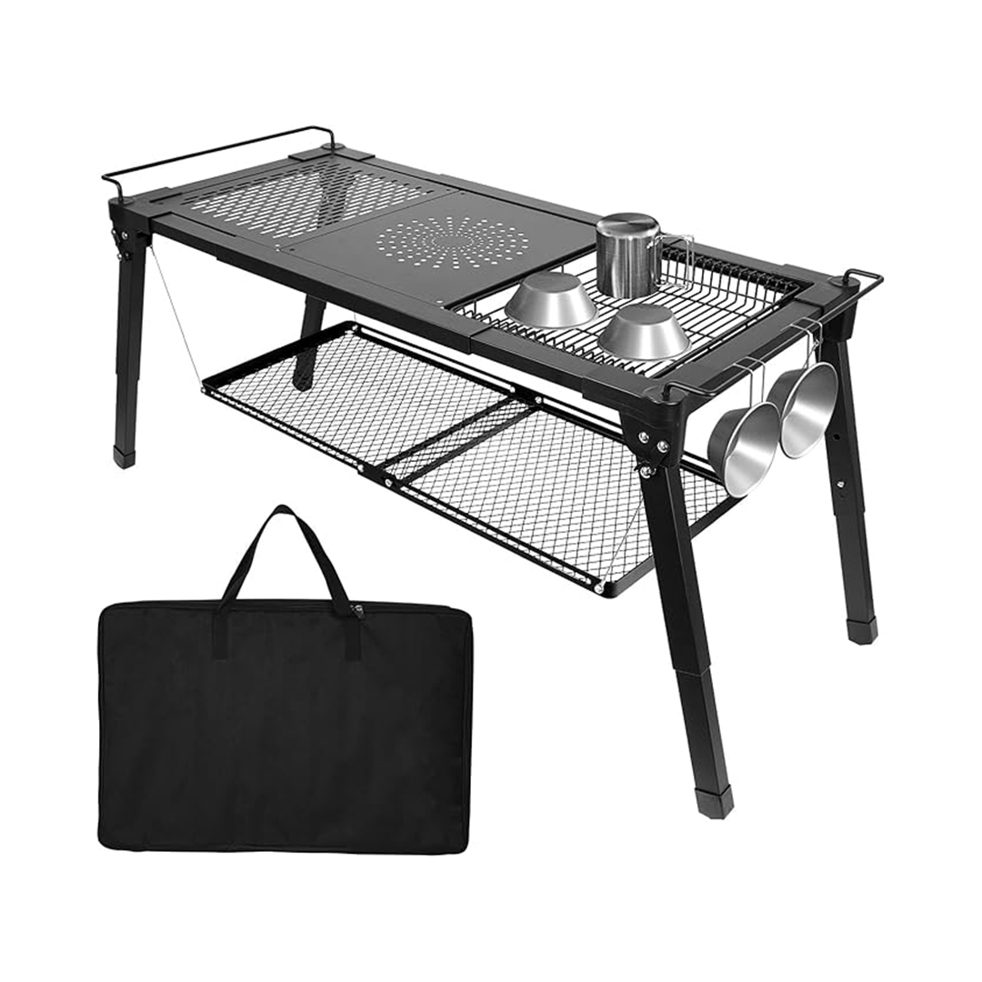 - UPDATED DETAILS – The portable grill table has been updated with multiple details and added more functions. An extra layer of detachable storage shelf has been added underneath to add more storage space. The tabletop is equipped with four carbon steel shelves, which can be freely combined. The width of the folding picnic table can also be adjusted according to your needs, from a full-open 34.6 inches to a half-open 24.8 inches.