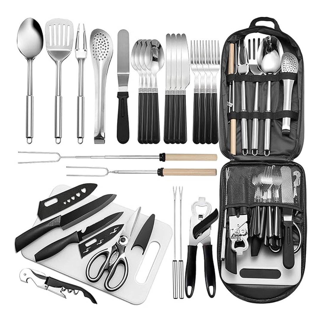 - Robust cookware made for the outdoors, When outside of your home’s comfort zone, you need camping accessories you can count on, our outdoor cooking kit features cutlery 100% made with high-end Stainless Steel for enhanced durability & reliability. Our utensils are also dishwasher-safe and are made to withstand years of constant use.
